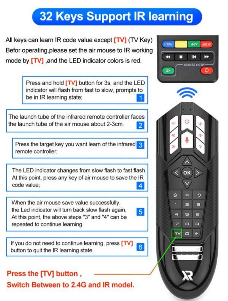 l Air mouse has 2.4G and IR working modes. The LED indicator color is blue in the 2.4g working mode and red in the IR working mode, and the switch mode is carried out by pressing the " TV " (TV) key.
